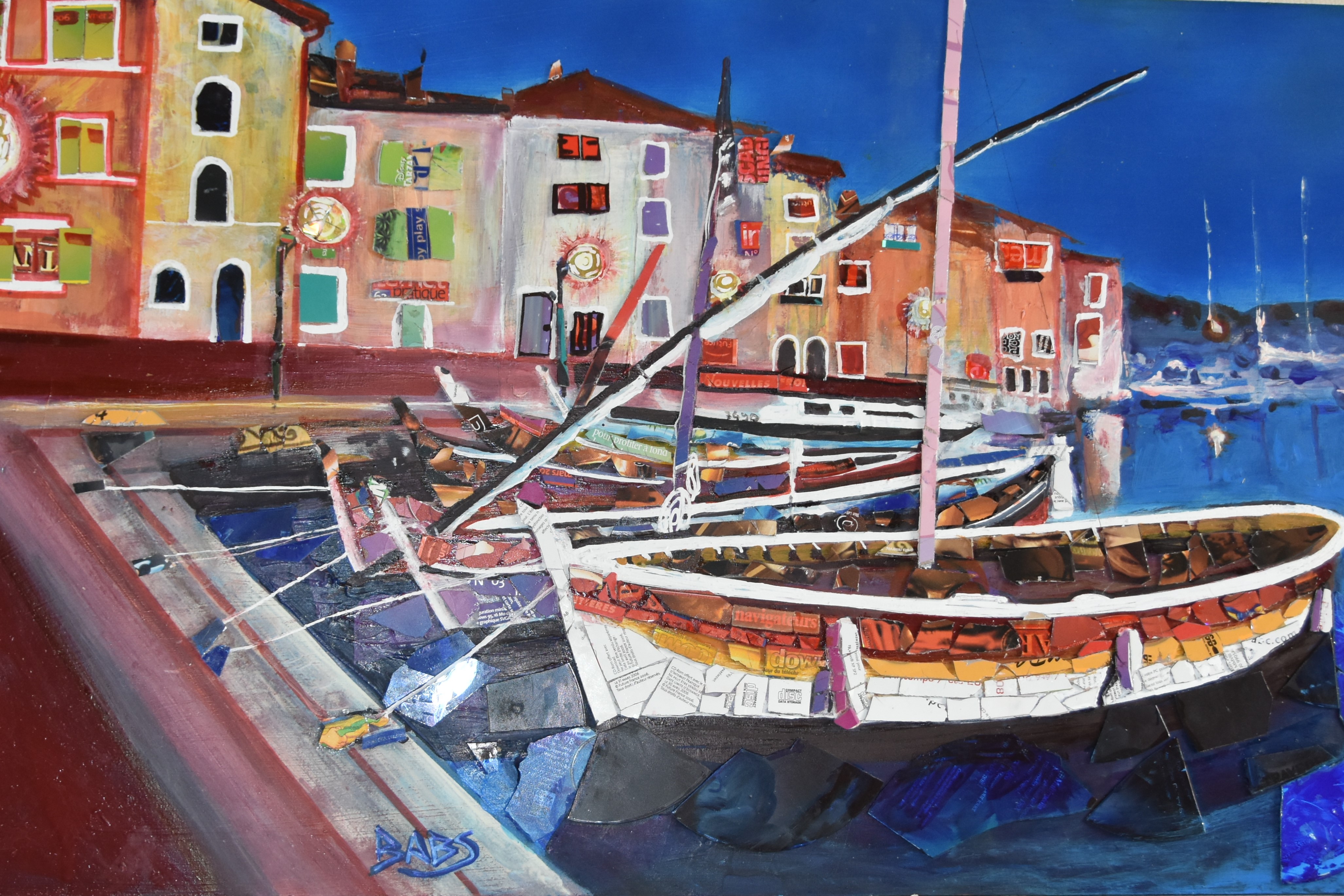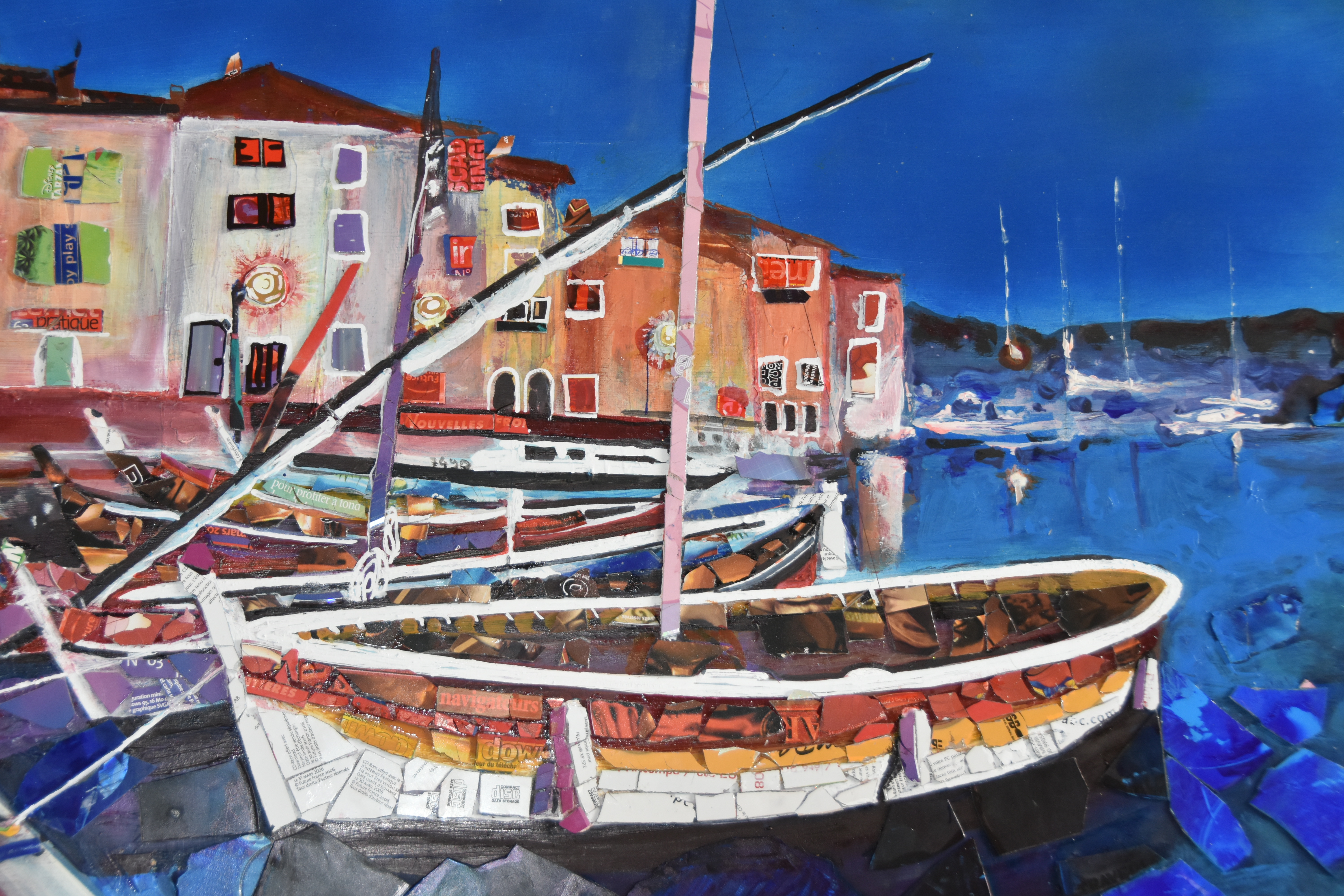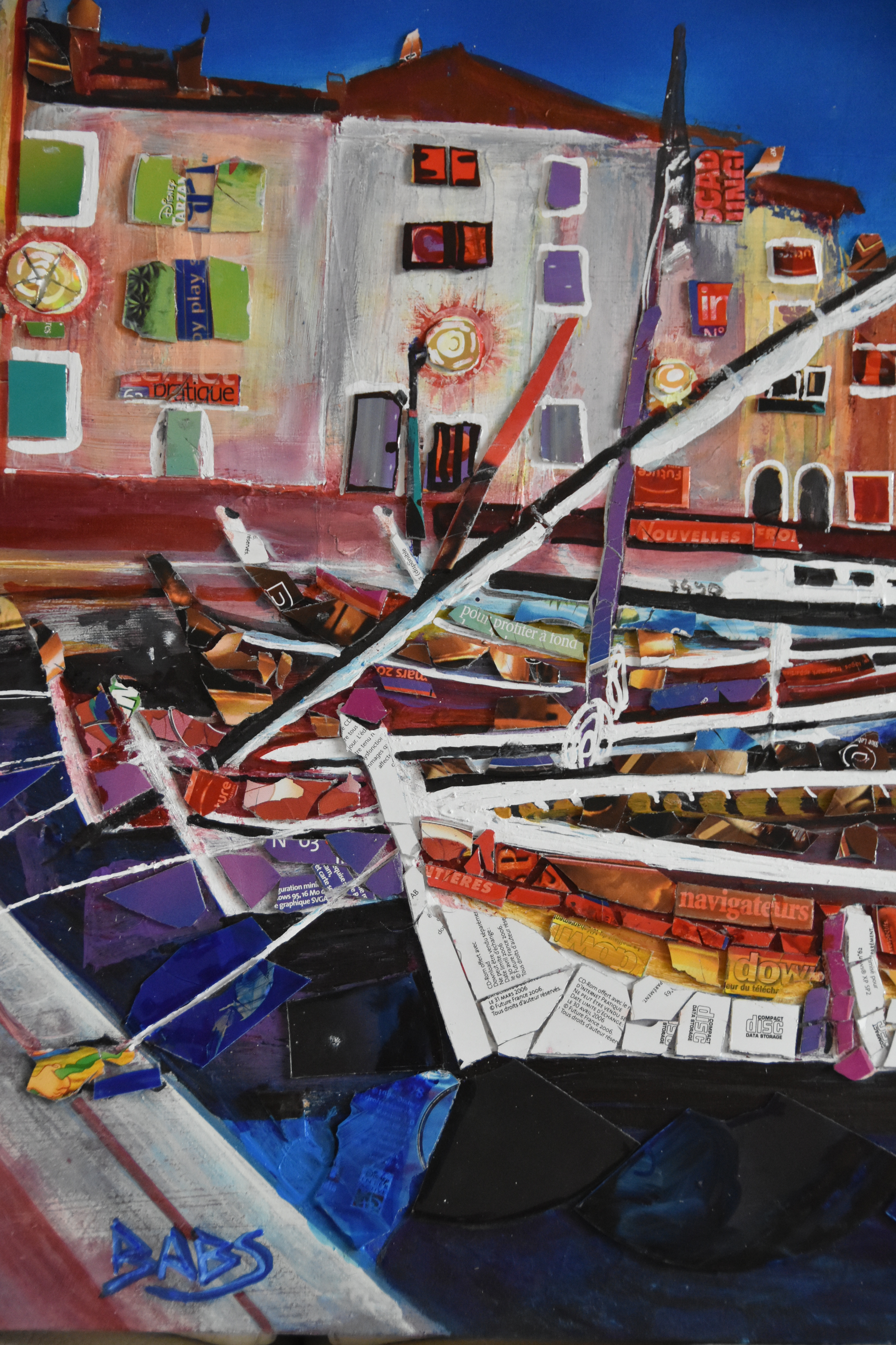 L’objectif est de partir de cette marine pour l’interpréter au delà de la peinture en y ajoutant des collages, de CDroms , ces objets déjà presque obsolètes, de notre société de consommation avide de nouvelles technologies s’opposant à la pérennité du petit port.