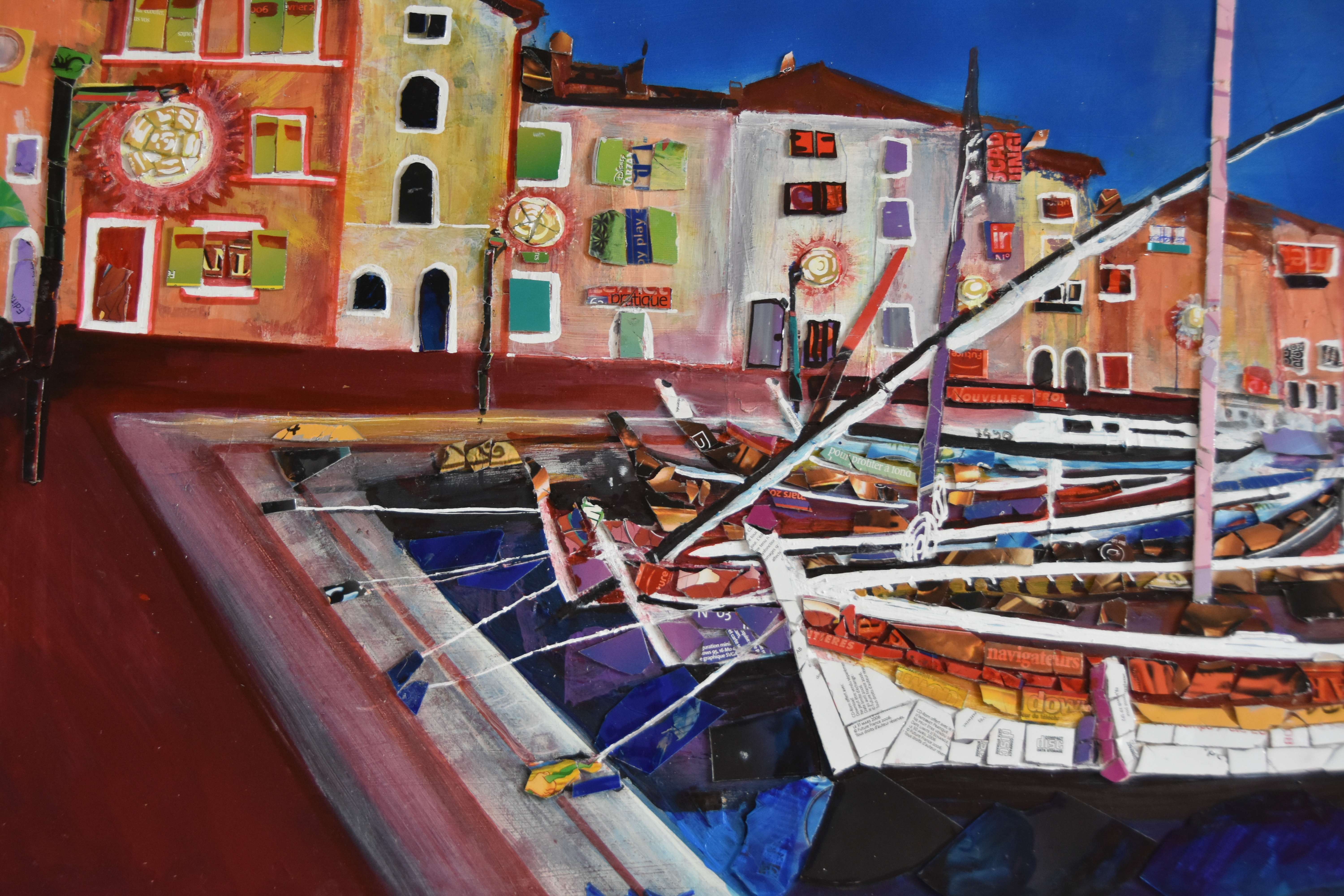 Le résultat offre une mosaïque très vive qui représente un paysage naïf de barques de pêcheurs dans un petit port du midi de la France.