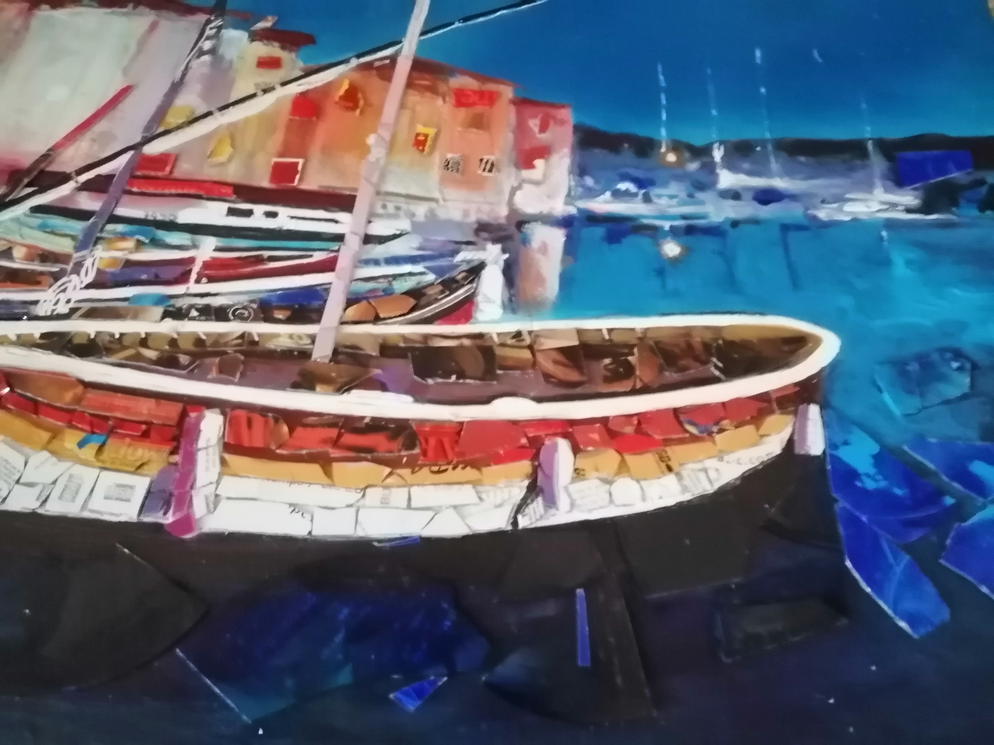 Ensuite, une image qui propose une composition compliquée de superpositions de barques, de formes oblongues, de couleurs lumineuses, de lumière crépusculaire et d’une ambiance méditerranéenne avec ces petites maisons très colorées.