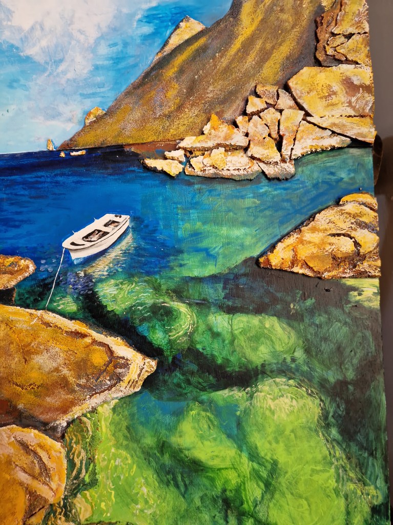Ce tableau évoque la beauté intemporelle des calanques de Marseille et la lumière méditerranéenne. Les rochers sculptés et usés par le temps, se reflètent dans une eau vert clair, calme et cristalline. La barque solitaire et sereine nous invite à la contemplation et à l’évasion.